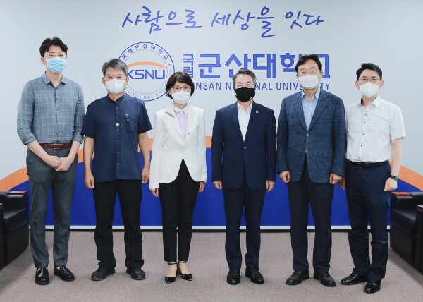 이혜자(왼쪽에서 세 번째) 군산대 교수가 20일 대학발전기금을 기부하고 곽병선(〃 네 번째) 총장 및 대학 관계자들과 기념촬영을 하고 있다. 사진=군산대 제공