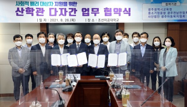 조선이공대에 따르면 각 기관은 지난 26일 ‘사회적 배려 대상자 지원을 위한 산학관 다자간 업무협약’을 체결하고, 시설보호 종료 대상자 등 지역의 사회적 배려 대상자들에게 안정적 생활기반과 배움의 기회를 제공해 건전한 직장인으로 성장할 수 있는 기반을 조성할 것을 약속했다.