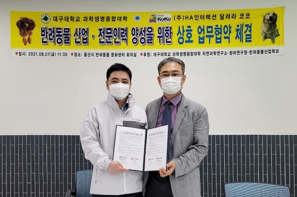 [대학저널 오혜민 기자] 대구대학교(총장 김상호)는 과학생명융합대학이 지난 27일 울산시 반려동물 문화센터 회의실에서 HA인터렉션 달려라코코와 반려동물산업 및 전문인력 양성을 위한 업무협약을 체결했다고 31일 밝혔다.