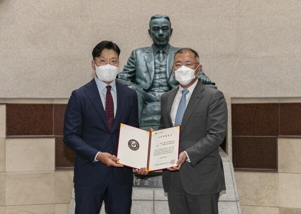 정 명예회장의 기부금에 대한 약정 체결식은 31일 고려대 인촌기념관에서 김재호 고려중앙학원 이사장과 정의선 현대차그룹 회장이 참석한 가운데 열렸다.