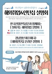 경상국립대에 따르면 13일 진행하는 한국산업인력공단과 함께하는 ‘찾아가는 해외취업 설명회’는 일본편과 미국편으로 나눠 2차례 온라인으로 진행한다. 일본과 미국의 취업정보를 얻고 싶거나, 해당 국가의 주요 직무와 유망 직종이 궁금한 청년은 누구나 참여 가능하다.