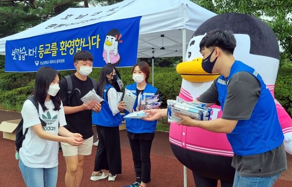 총학생회는 2일 오전 교내 정문 사거리에서 개인위생 및 방역수칙을 준수한 가운데 등교하는 학생들을 대상으로 개강인사와 함께 코로나 자가진단키트를 나눠주며 ‘건강한 2학기를 보내자’는 응원 메시지를 전달했다.