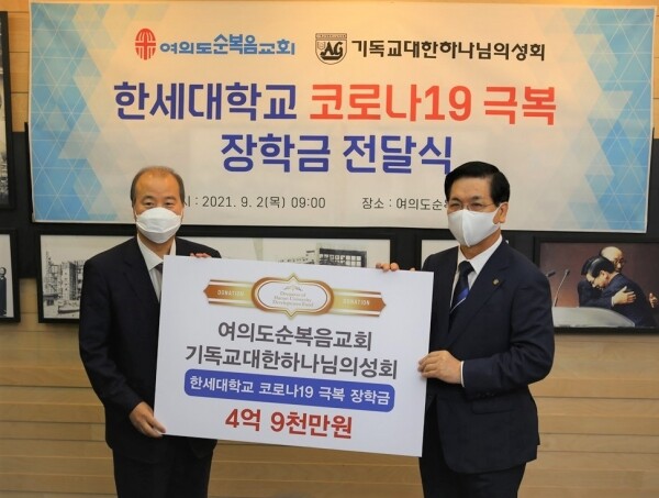 한세대에 따르면 장학금은 신종 코로나바이러스 감염증(코로나19)으로 어려움을 겪고 있는 학생들을 위해 마련된 것으로, 여의도순복음교회는 학부·일반대학원에 4억4000만원, 기하성 총회는 영산신학대학원에 5000만원의 장학금을 각각 전달했다.