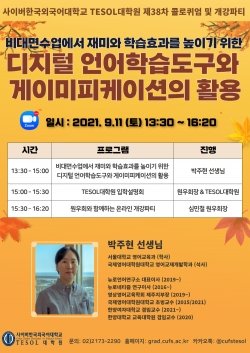 TESOL대학원은 이날 특강과 더불어 2021학년도 2학기 개강 파티와 11월 중순경부터 실시 예정인 2022학년도 1학기 TESOL대학원 신입생 입학설명회도 진행할 계획이다.