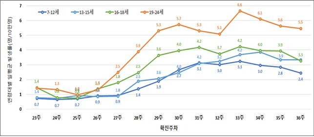 19~24세 10만명당 일평균 확진자, 7~18세보다 2~3명 많아