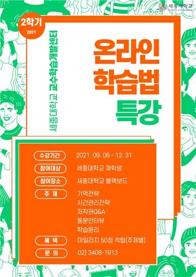 [대학저널 임지연 기자] 세종대학교(총장 배덕효)는 교수학습개발센터가 오는 12월 31일까지 2021학년도 2학기 온라인 학습법 특강을 진행한다고 19일 밝혔다.