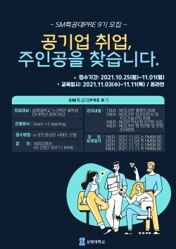[대학저널 백두산 기자] 상명대학교(총장 홍성태)는 대학일자리센터가 오는 3일부터 NCS(국가직무능력표준) 직업 기초능력 평가와 직무 수행 능력 평가 교육프로그램인 SM 특공대 PRE를 운영한다고 1일 밝혔다.