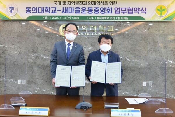 [대학저널 백두산 기자] 동의대학교(총장 한수환)는 새마을운동중앙회(회장 염홍철)와 새마을동아리 운영과 지역 혁신성장 연계 공동사업 개발 등에 관한 업무협약을 체결했다고 4일 밝혔다.