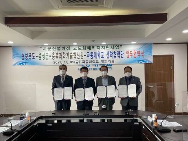 [대학저널 이승환 기자] 극동대학교(총장 류기일)는 5일 시군 산업거점 고도화 패키지 지원사업 추진을 위해 충북도-음성군-충북과학기술혁신원과 대학본관 회의실에서 업무협약을 체결했다.