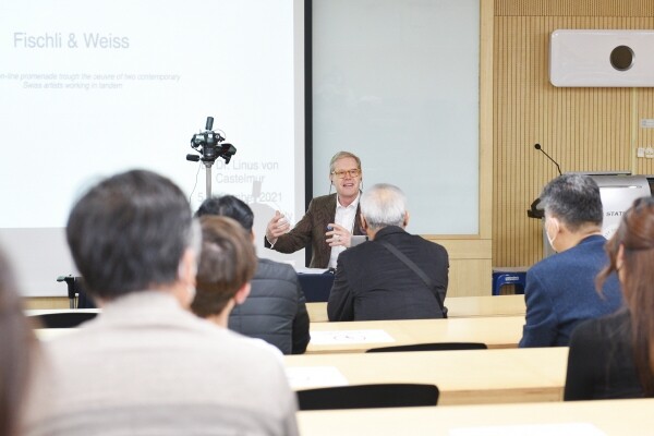 카스텔무르 대사는 사진·영상을 기반으로 활발한 작품 활동을 선보여 온 스위스를 대표하는 작가 듀오 페터 피슐리와 다비드 바이스에 대한 얘기를 중심으로 강연을 했다. 이어 최근 주한 스위스 대사관과 한국 사진작가들이 함께 완성한 포토북 Breathing Walls(숨쉬는 벽)도 소개했다.