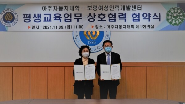 [대학저널 백두산 기자] 아주자동차대학(총장 박병완)은 보령여성인력개발센터(유영미 관장)와 지난 9일 지역사회 평생교육 활성화를 위한 평생교육업무 상호협력 협약을 체결하고 지역의 평생교육 발전을 위해 협력하기로 했다고 10일 밝혔다.