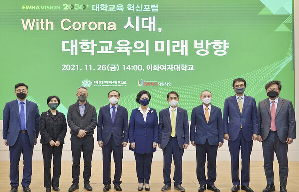 이번 포럼은 ‘With Corona 시대, 대학교육의 미래방향’을 주제로 코로나19 팬데믹을 경험한 대학들이 해결해야 할 문제를 제시하고 성공적인 미래교육 패러다임 전환방향을 모색하기 위해 마련됐으며, 이화여대와 서울대, KAIST 총장을 비롯한 주요 대학 교수 및 관계자들이 참석했다.