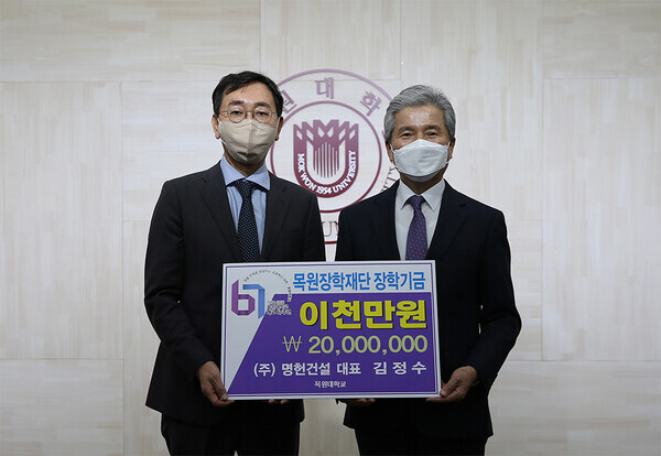 [대학저널 오혜민 기자] 목원대학교(총장 권혁대)는 김정수 명헌건설 대표가 목원장학재단 장학기금 2000만 원을 전달했다고 21일 밝혔다.