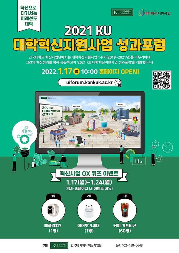 [대학저널 임지연 기자] 건국대학교(총장 전영재)는 자교 혁신사업단이 오는 17일 ‘2021 KU 대학혁신지원사업 성과포럼: 혁신으로 다가서는 미래선도대학’을 연다고 12일 밝혔다.