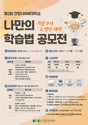 [대학저널 오혜민 기자] 건양사이버대학교(이원묵 총장)는 오는 2월 7일까지 제2회 나만의 학습법 공모전을 연다고 17일 밝혔다.