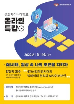 [대학저널 백두산 기자] 경희사이버대학교(총장 변창구)는 오는 19일 유튜브를 통해 ‘AI시대, 일상 속 나의 보안을 지키자’ 특강을 실시한다고 18일 밝혔다.