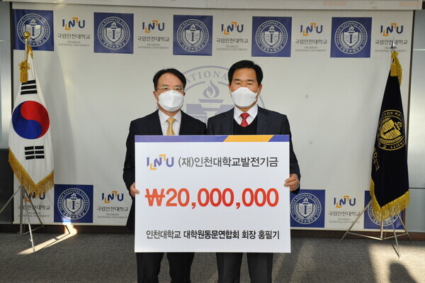 [대학저널 백두산 기자] 인천대학교(총장 박종태)는 홍필기 인천대 대학원동문연합회 회장(서인천종합서비스 대표)이 지난 18일 (재)인천대학교발전기금에 2천만원을 기탁했다고 19일 밝혔다.