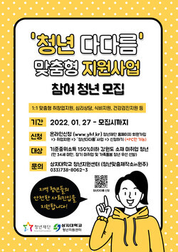 사업 신청은 오는 27일부터 청년재단 홈페이지에서 신청할 수 있으며, 사전인터뷰를 통해 선정된 30명은 선정 시부터 12월 말까지 프로그램에 참여하게 된다. 자세한 문의는 상지대 청년지원센터(청년맞춤제작소in원주) 033-738-8062∼3으로 하면 된다.