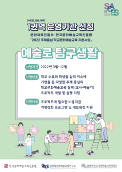 2022 주제중심 학교문화예술교육 지원사업 ‘예술로 탐구생활’은 학교 교사와 예술가의 프로젝트 공동 개발 및 운영의 지원을 통해 학교문화예술교육의 다양성을 높이고, 지역 내 예술가와 학교 간의 지속적 협력 체계가 마련될 수 있도록 지원하는 사업이다.