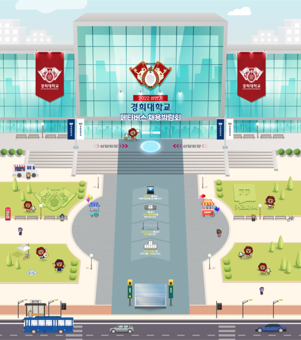 메타버스 공간에 들어오면 가장 먼저 경희대 공식 캐릭터인 쿠옹이 맞이하는 로비에 들어선다. 이후 박람회장에 들어가면 삼성과 LG, 포스코, 현대 등 국내외 주요 기업의 70여개 부스가 이들을 기다린다.
