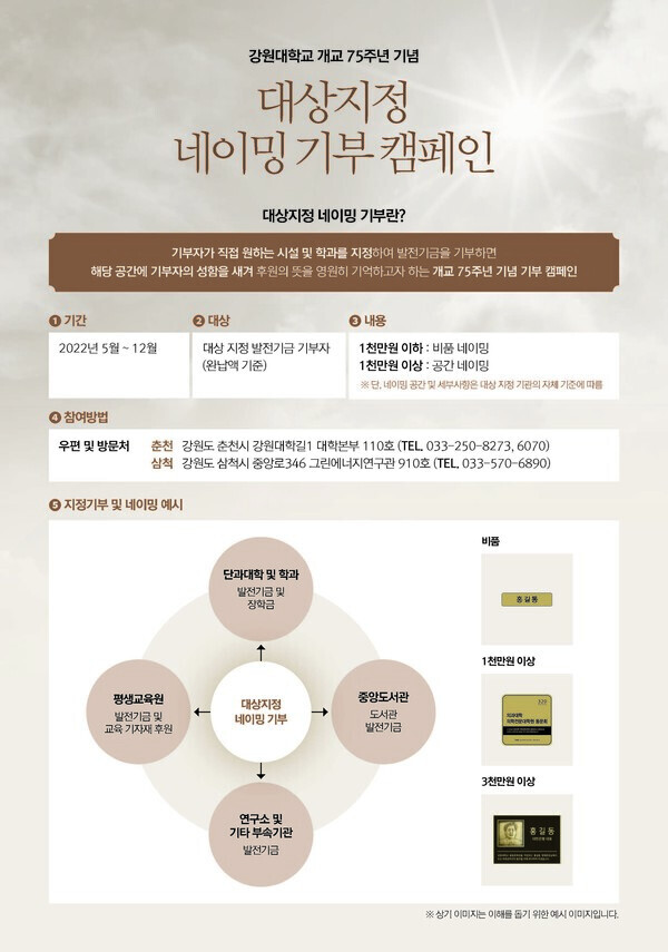 [대학저널 황혜원 기자] 강원대학교가 오는 6월 14일 개교 75주년을 맞아 대학 발전과 새로운 도약의 발판을 마련하기 위한 ‘개교 75주년 대상지정 네이밍 기부 캠페인’을 시작한다.