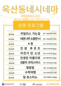 옥산 동네시네마 개관 기념으로 4월 29일 정형민 감독의 ‘카일라스 가는 길’, 4월 30일 이창원 감독의 ‘내겐 너무 소중한 너’가 상영됐으며, 영화 상영 후에는 군산시민과 감독과의 대화시간을 통해 영화의 배경과 감상평을 공유했다.