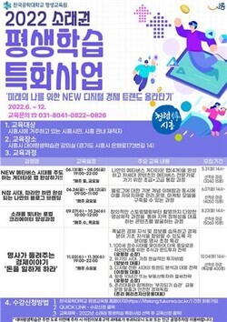 한국공대는 평생교육원이 2022 소래권 평생학습 특화사업 ‘미래의 나를 위한 NEW 디지털 경제 트렌드 올라타기’ 수강생을 모집한다고 3일 밝혔다.