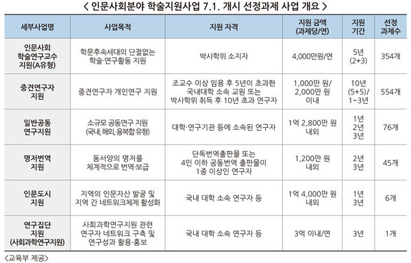 인문사회분야 학술지원사업은 인문사회분야 학술·연구역량을 강화하고 학문 균형 발전을 위해 지난 1963년부터 시행되고 있다.