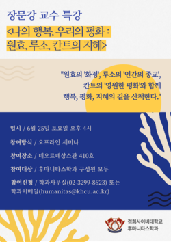 [대학저널 오혜민 기자] 경희사이버대학교는 후마니타스학과가 오는 25일 학과 구성원을 대상으로 ‘나의 행복, 우리의 평화 : 원효, 루소, 칸트의 지혜’ 특강을 연다고 24일 밝혔다.
