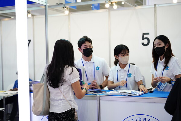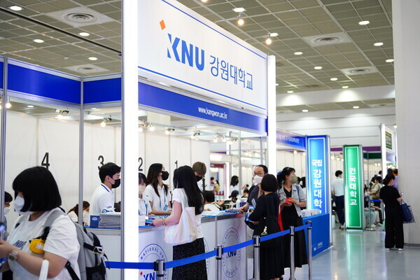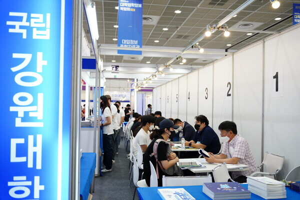 [대학저널 황혜원 기자] 한국대학교육협의회가 주최하는 '2023학년도 수시 입학정보박람회'(이하 수시박람회)가 20일부터 23일까지 서울 삼성동 코엑스에서 열린다. 이번 수시박람회에는 전국 149개 대학이 참가한다. 현재 수험생들이 대학부스에서 입시 상담을 진행하고 있다. 사진은 강원대 상담부스 모습.