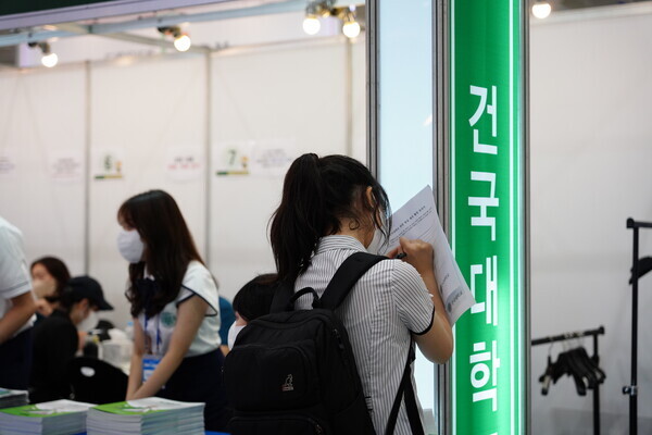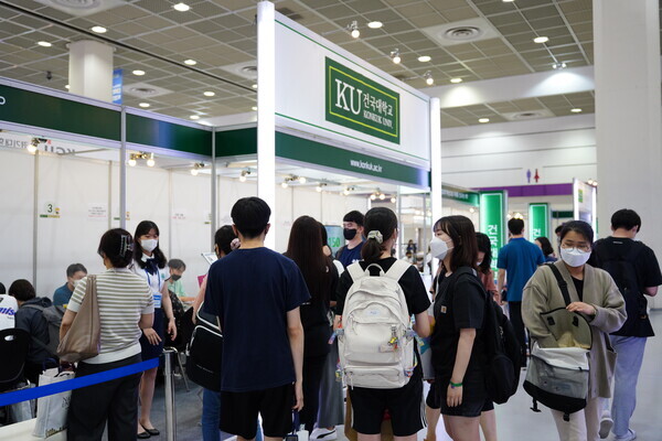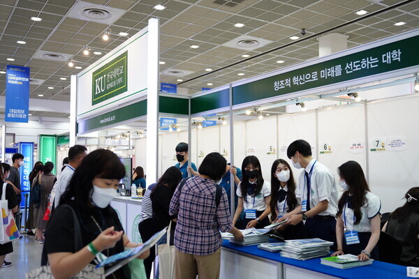 [대학저널 황혜원 기자] 한국대학교육협의회가 주최하는 '2023학년도 수시 입학정보박람회'(이하 수시박람회)가 20일부터 23일까지 서울 삼성동 코엑스에서 열린다. 이번 수시박람회에는 전국 149개 대학이 참가한다. 현재 수험생들이 대학부스에서 입시 상담을 진행하고 있다. 사진은 건국대 상담부스 모습.