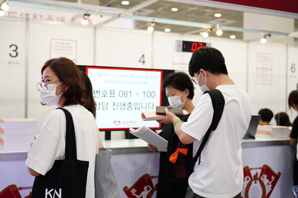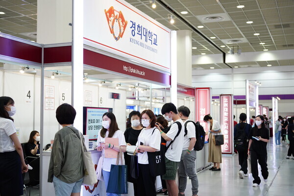 [대학저널 황혜원 기자] 한국대학교육협의회가 주최하는 '2023학년도 수시 입학정보박람회'(이하 수시박람회)가 20일부터 23일까지 서울 삼성동 코엑스에서 열린다. 이번 수시박람회에는 전국 149개 대학이 참가한다. 현재 수험생들이 대학부스에서 입시 상담을 진행하고 있다. 사진은 경희대 상담부스 모습.