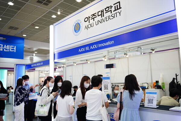[대학저널 황혜원 기자] 한국대학교육협의회가 주최하는 '2023학년도 수시 입학정보박람회'(이하 수시박람회)가 20일부터 23일까지 서울 삼성동 코엑스에서 열린다. 이번 수시박람회에는 전국 149개 대학이 참가한다. 현재 수험생들이 대학부스에서 입시 상담을 진행하고 있다. 사진은 아주대 상담부스 모습.