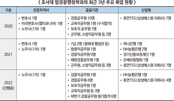 호서대 법경찰행정학과는 출범 때부터 기존 법학전공에 전공교육고도화사업으로 변호사 등 전문자격사와 공무원 시험에 필수적인 경찰행정학 교육과정을 융복합했다.